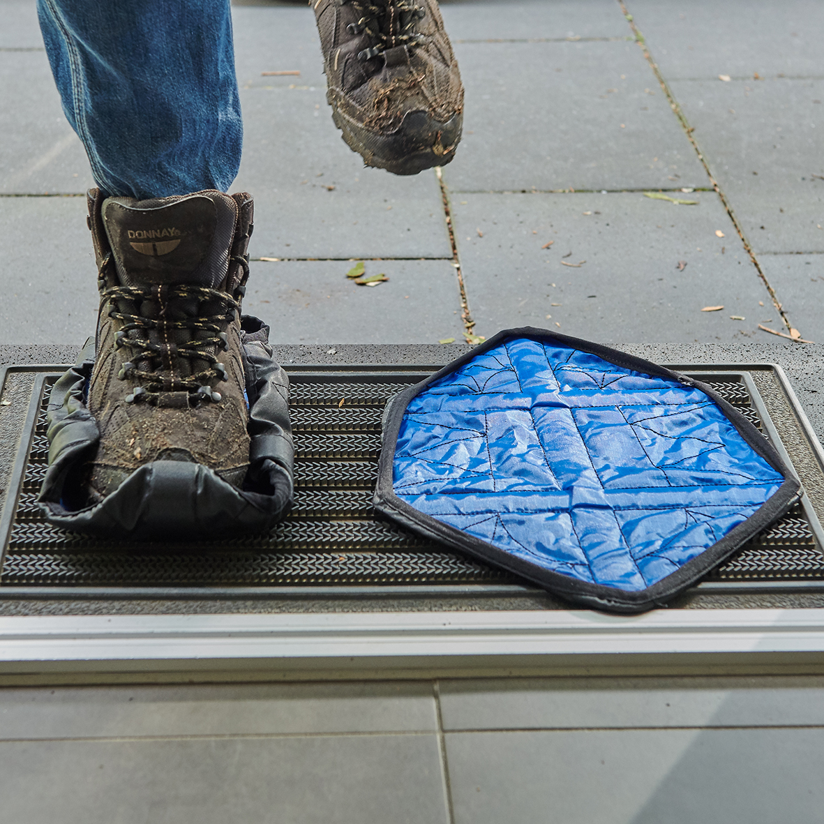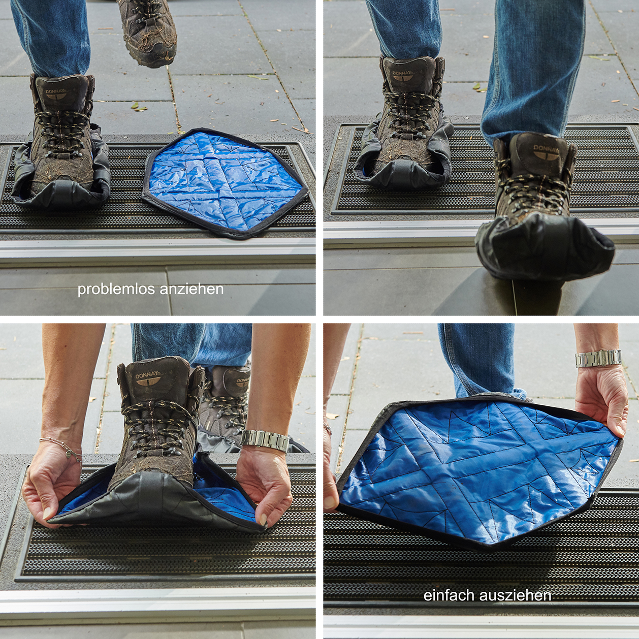 Ohne Ihre Hände zu benutzen, treten Sie einfach mitten auf die Markierung von MAXCLIP N´GO. Der Schutz faltet sich automatisch um Ihren Schuh. Der erhöhte Rand verhindert, das Schmutz austritt.
