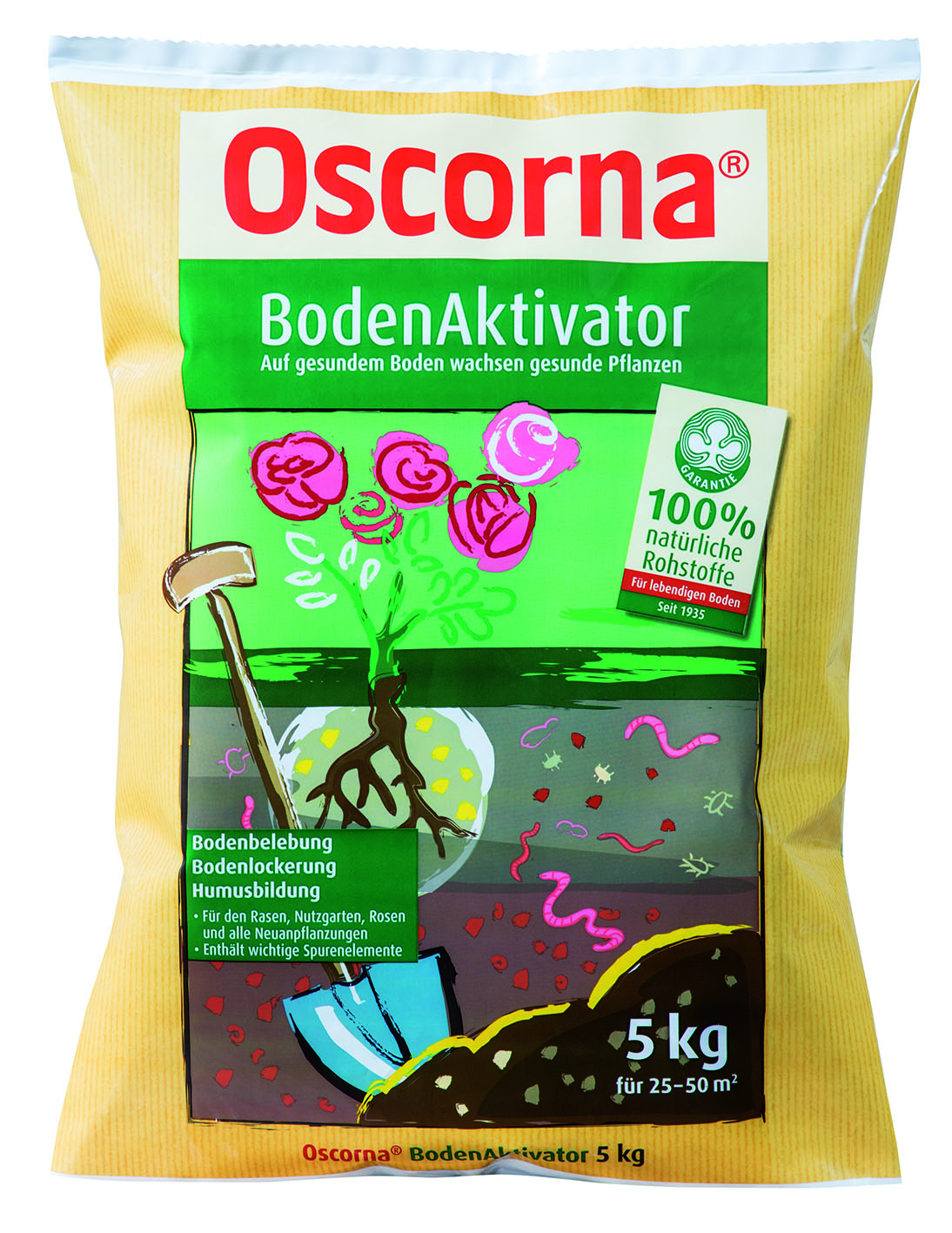 Als Bodenhilfsstoff ist der Oscorna-BodenAktivator reich an organischen Substanzen und natürlich wirkenden Mineralstoffen. Er sorgt für eine dauerhafte Bodenfruchtbarkeit, verbessert die Bodenstruktur sowie den Wasser-, Luft- und Wärmehaushalt und versorgt Bodenorganismen mit wichtigen Spurenelementen. Durch den enthaltenen Algenkalk wird der pH-Wert langfristig auf einem optimalen Niveau stabilisiert.
