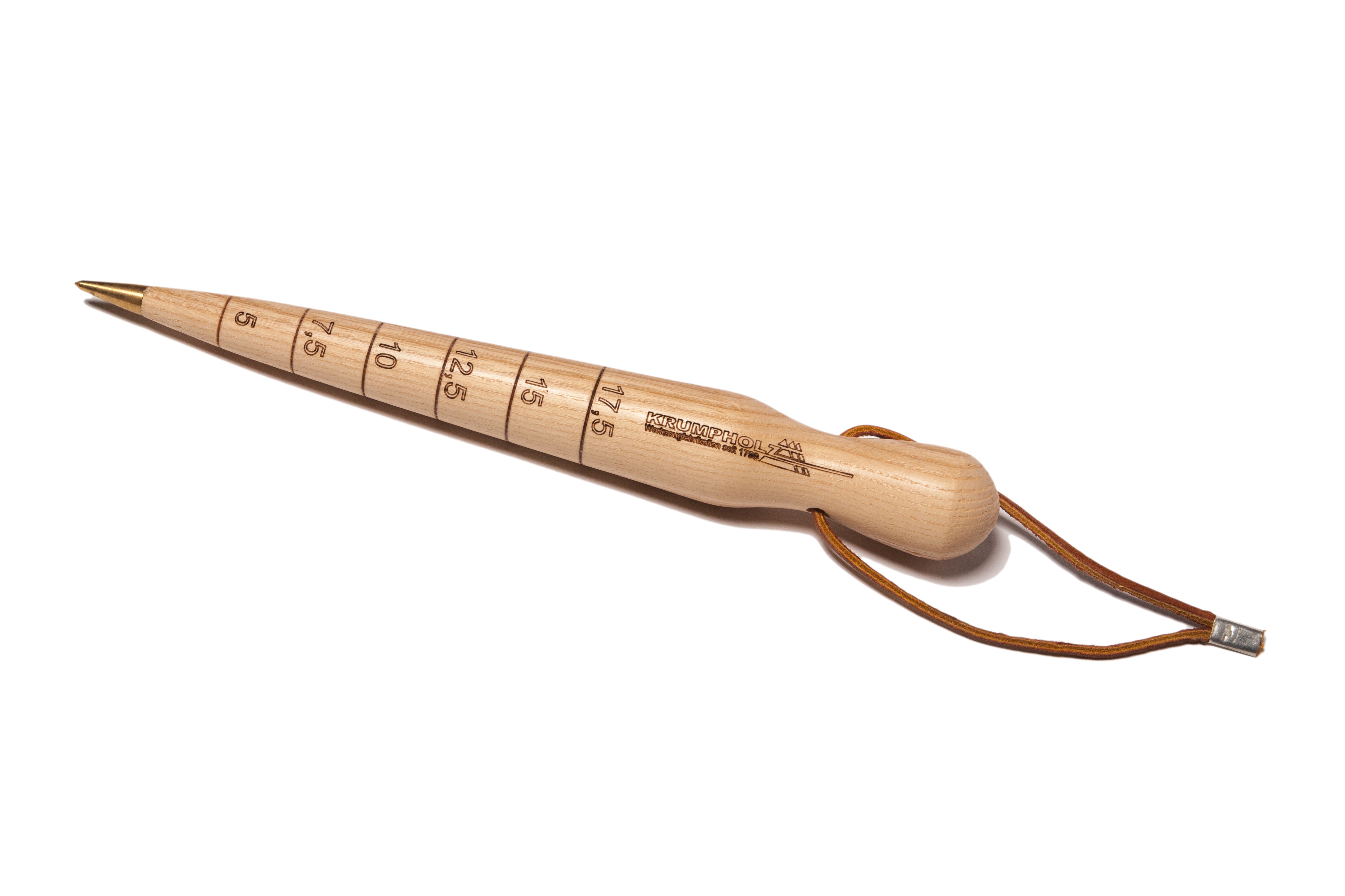 Ein praktisches Pflanzholz von Krumpholz mit Messingspitze, Lederband und Maßskala um Pflanz- / Saattiefe sauber kontrollieren zu können.