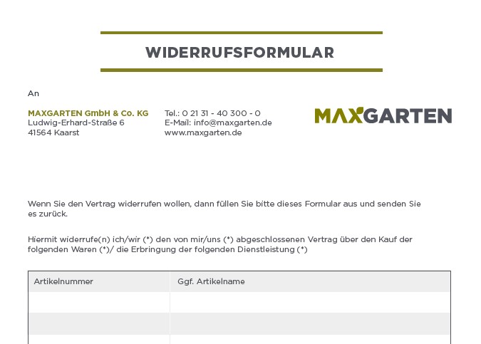 Um Ihr Widerrufsrecht auszuüben, müssen Sie uns (maxGarten GmbH & Co. KG, Ludwig-Erhard-Str., 6, Kaarst, info@maxgarten.de, Telefon: 02131-4030015, Telefax: 02131-40300925) mittels einer eindeutigen Erklärung (z.B. ein mit der Post versandter Brief, Telefax oder E-Mail) über Ihren Entschluss, diesen Vertrag zu widerrufen, informieren. Sie können dafür das beigefügte Muster-Widerrufsformular verwenden, das jedoch nicht vorgeschrieben ist.